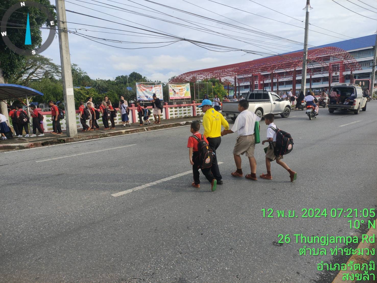 พ.ต.ต.พูนพงศ์ แสงจันทร์ศิริ สวป.(ชส.) สภ.รัตภูมิ , ด.ต.สุธรรม เกิดตลอด ผบ.หมู่ (ป.) สภ.รัตภูมิ ทำหน้าที่ จิตอาสา , ด.ต.สยาม บุญรัตน์ ผบ.หมู่ (ป.) สภ.รัตภูมิ ทำหน้าที่ จราจร ,ร่วมกับฝ่าย ครู อำนวยความสะดวกด้านการจราจรแก่นักเรียน ผู้ปกครอง ตลอดผู้ใช้รถใช้ถนนเส้นทางยนตร์การกำธร และจัดระเบียบการจราจรช่วงเช้า หน้า ร.ร.บ้านกำแพงเพชร ม.3 ต.ท่าชะมวง อ.รัตภูมิ จว.สงขลา