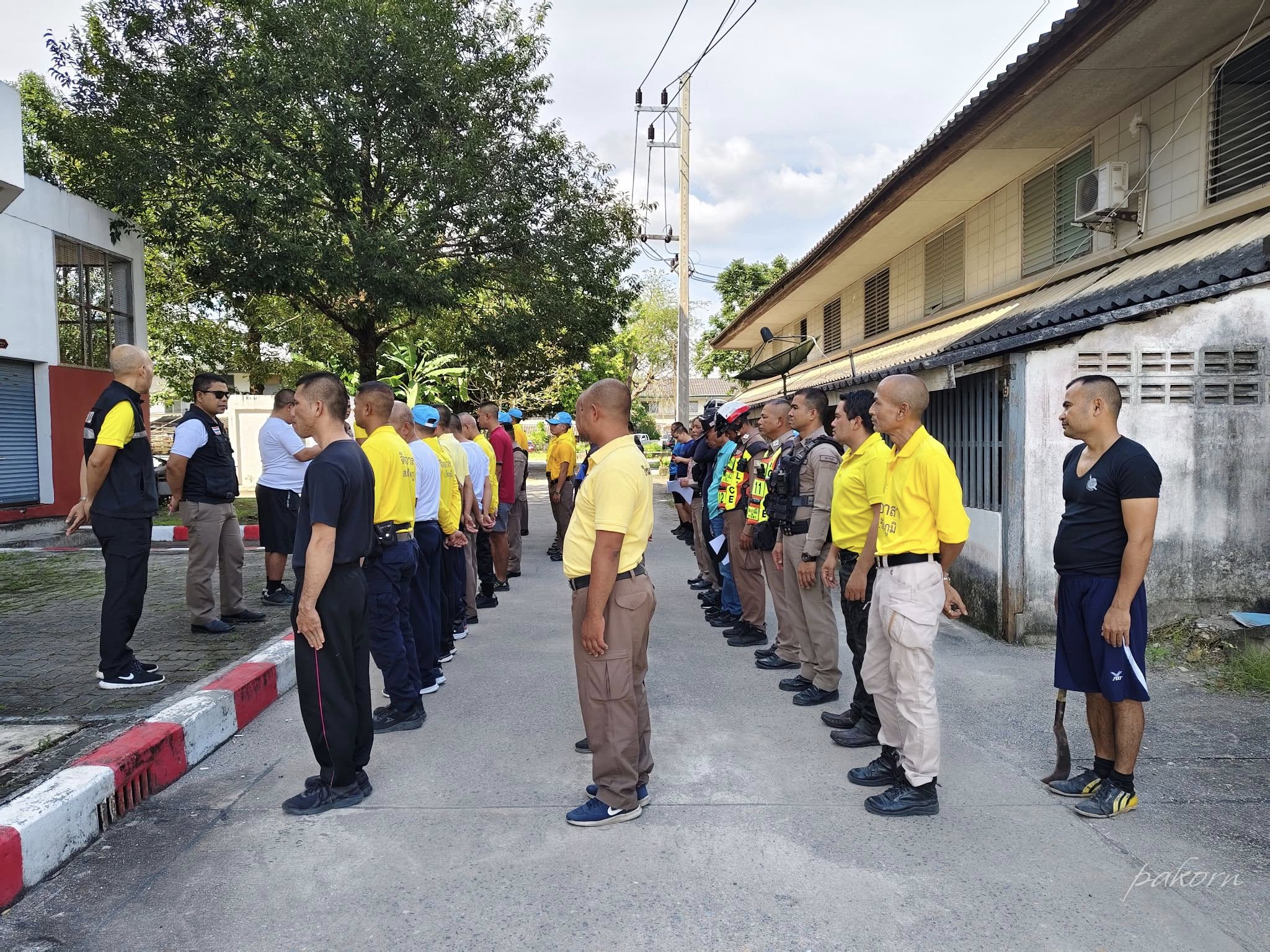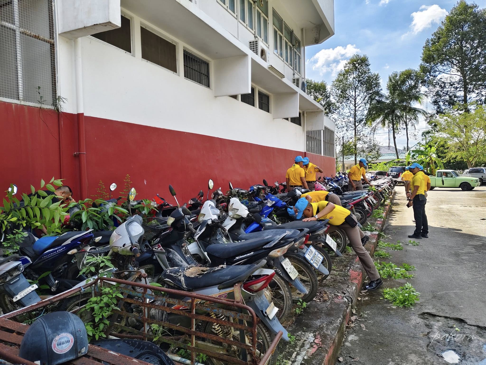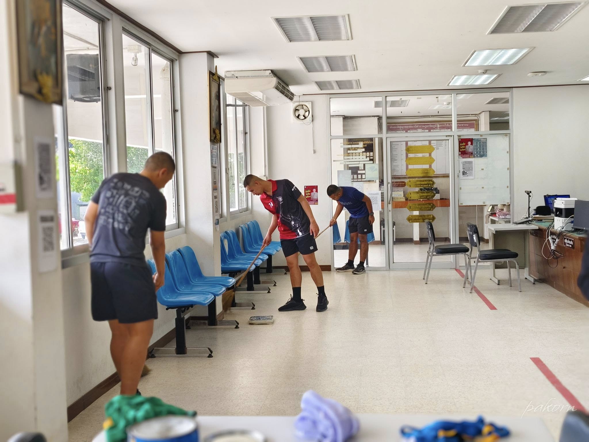 สว.(สอบสวน)ฯ(หน.งานคดี),พ.ต.ท.พิเชษฐไชย สุริยะชัยกุลพงศ์ สวป.,พ.ต.ต.พูนพงศ์ แสงจันทร์ศิริ สวป.(ชส.) นำข้าราชการตำรวจในสังกัด,นสต.ฝึกปฏิบัติราชการ ลงแถวพัฒนาที่ตั้ง ตัวอาคาร ,ชั้นดาดฟ้า,รอบที่ทำการ