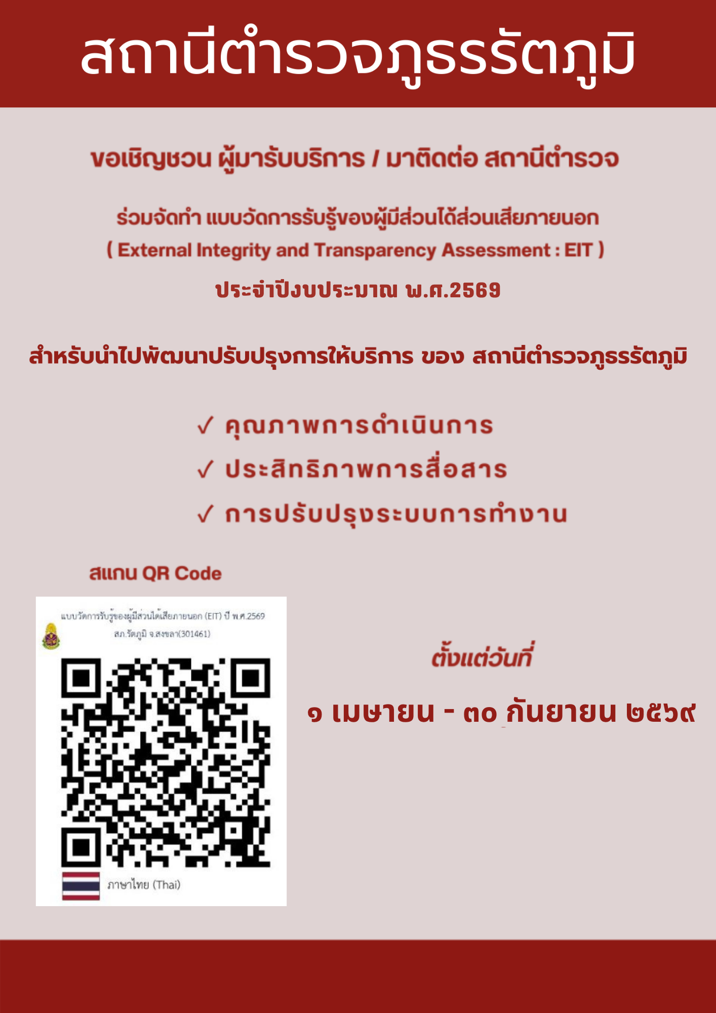ประชาสัมพันธ์ข้อมูลการประเมินคุรธรรมและความโปร่งใสในการดำเนินงานของหน่วยงาน ภาครัฐ (Integrity and Transparency Assessment : ITA ) ของสถานีตำรวจ ประจำปีงบประมาณ พ.ศ.2568
