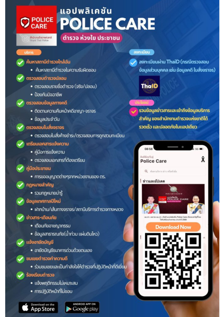 Police Care คือแอปที่ช่วยให้ประชาชนเข้าถึงข้อมูลและบริการที่เกี่ยวกับตำรวจได้ง่ายและรวดเร็ว ทั้งการค้นหาสถานีใกล้ฉัน ตรวจสอบข้อมูลที่ติดต่อ ตลอดจนอ่านข่าวและคู่มือการดำเนินเรื่องสำคัญในชีวิตประจำวันอย่างเป็นขั้นตอน